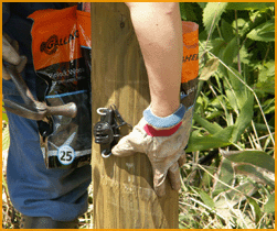 電気柵のコーナー部分などの木柱には、中間碍子を取り付けます。